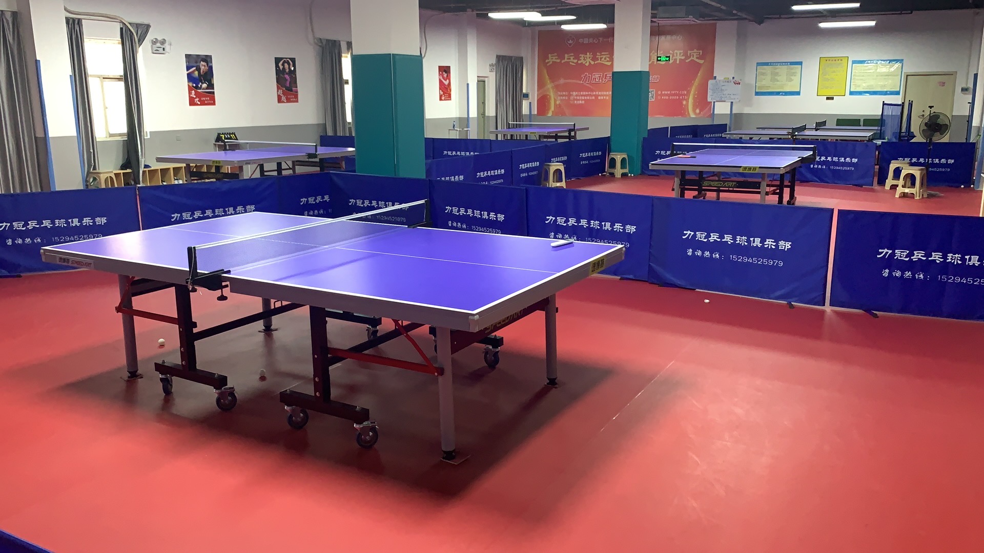 - 100分球馆700多平,有比赛区和教学区。比赛区有国际赛事用的10台大彩虹,教学区有六张标准